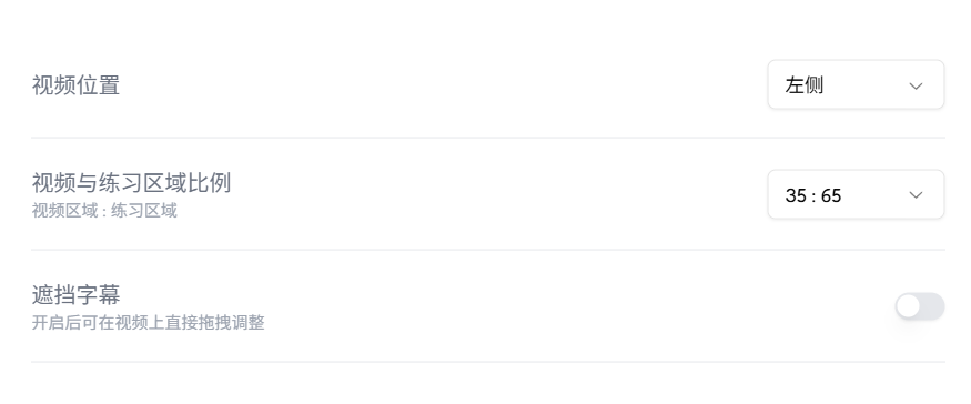 - 视频与练习区域比例:如 35:65(可拖动调节)