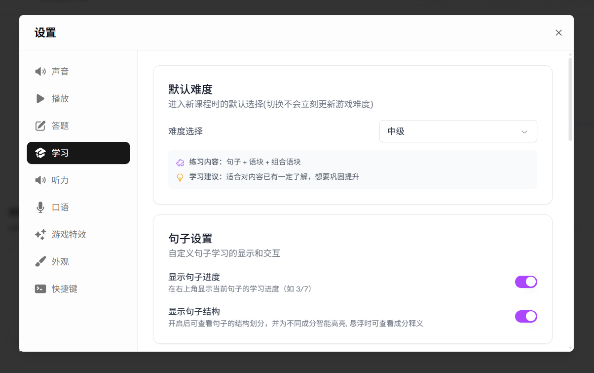通过设置可以自定义句乐部的各种功能,让学习体验更符合你的习惯。